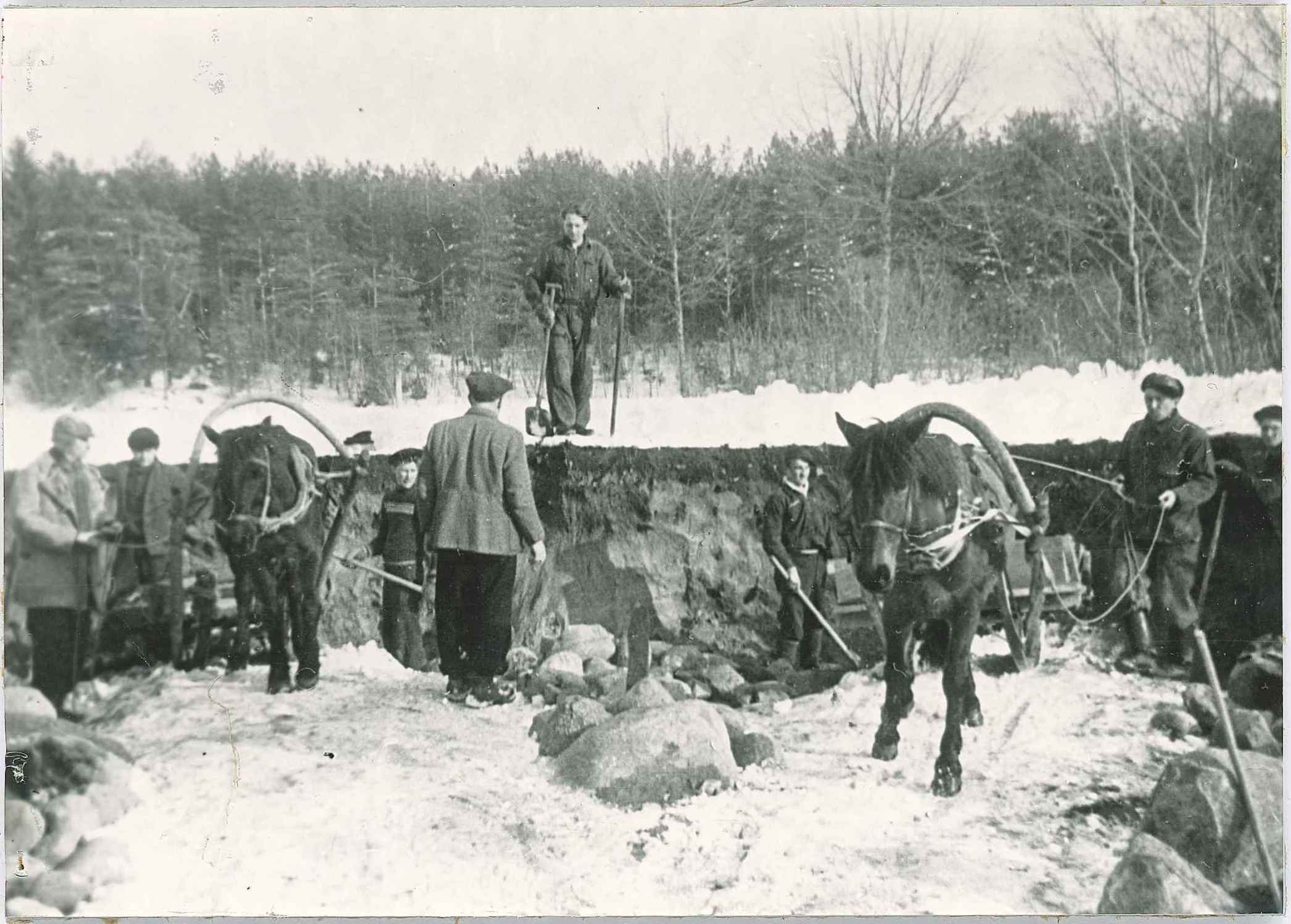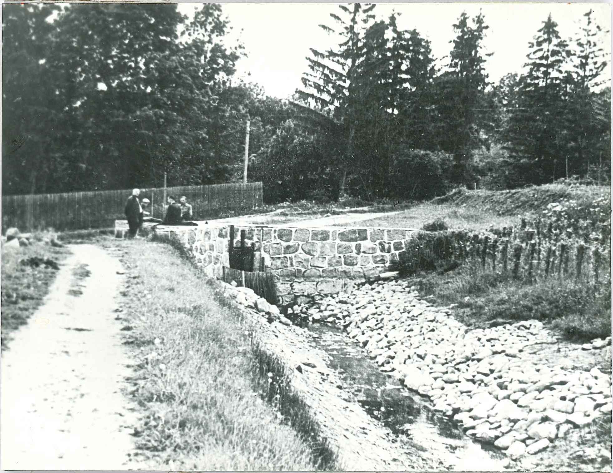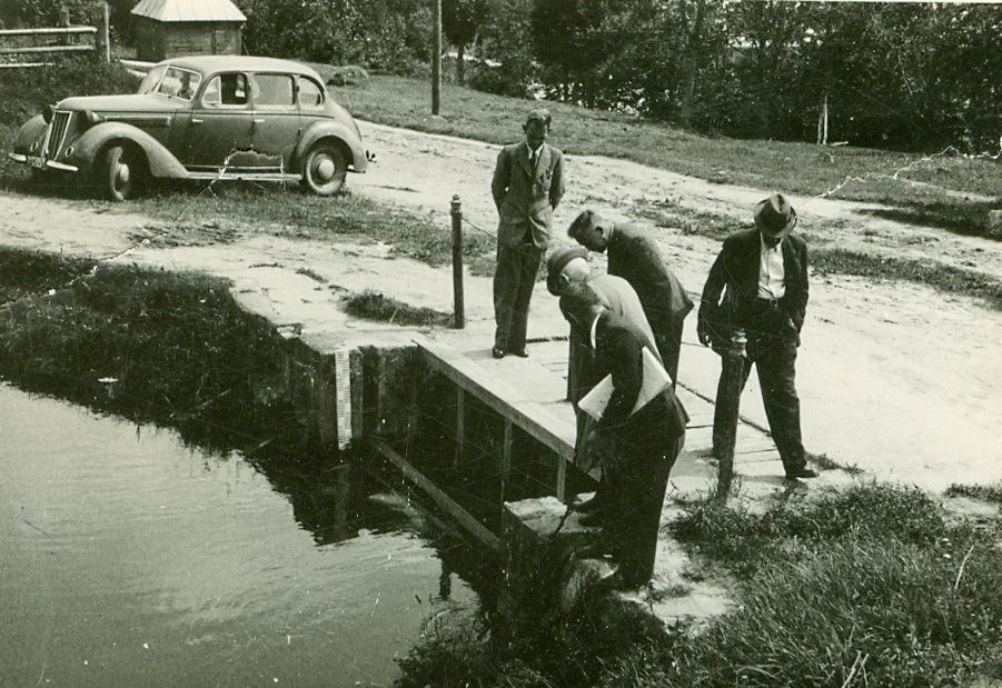 Inženieri aplūko ūdens ieplūdes vietu uz Smiltenes HES. 1942. gads.