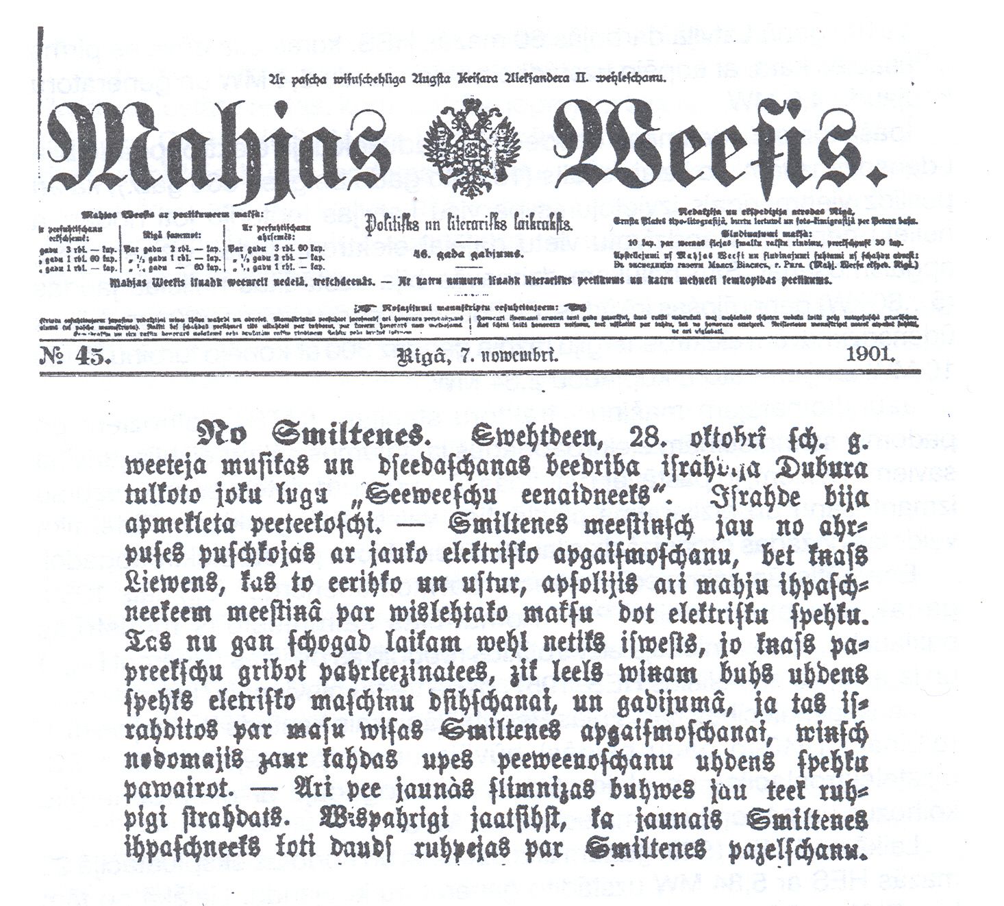 "Smiltenes miestiņš jau no ārpuses pušķojas ar jauko elektrisko apgaismošanu, bet kņazs Līvens, kas to ierīko un uztur, apsolījis arī māju īpašniekiem miestiņā par vislētāko maksu dot elektrisko spēku. Tas nu gan šogad vēl netiks izvests, jo kņazs papriekšu gribot pārliecināties, cik liels būs ūdens spēks elektrisko mašīnu dzīšanai un gadījumā, ja tas izrādītos par mazu visas Smiltenes apgaismošanai, viņš nodomājis caur kādas upes pievienošanu ūdens spēku pavairot."